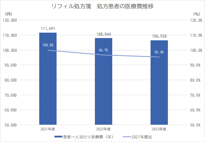 病状の変化もあるため一概には言えませんが、定期的に通院している患者が、安定的にリフィル処方箋を処方された場合、2021年度と比較して2022年度で3,647円、2023年度で5,141円程度、対象者1人当たりの外来医療費(10割)が減少していることが分かりました。